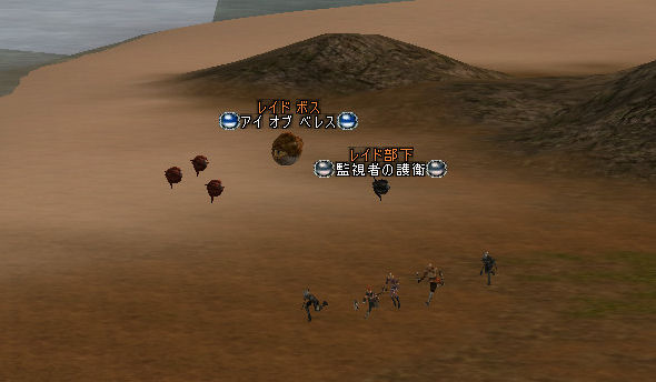 ふと気がつくと、見下ろした浜辺に見慣れないMOBがいる。レイドボスってヤツらしいです。処刑場でもこないだ見たなあ。業者さんに狩りまくられて民間人はレイド大会がしづらくなっているらしい昨今、だれか見つけて退治しに来るのかなと思ってPTマッチ覗いてみたらすでに告知が。お一人見張りらしき人が来たな、と思ったらわらわら集まってきた。その間もBOT一味は電車ごっこしてます。
