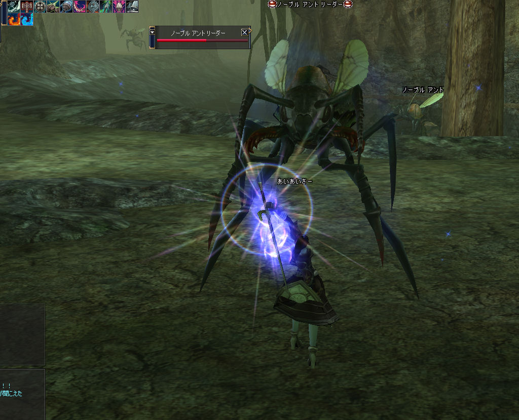 今日は何人かがやってます。まずひとりでアント系を狩ってる人が。手前でちょっと待って通り過ぎたのに、迷って反対側からまたそこに来ちゃった。もうちょっと行ったら例のソルジャーアント系うじゃうじゃの部屋。幸い二人組槍PTがいたので、彼らを邪魔しないように通過。それでもアク蟻がつついてくるので通路まで連れてって斬る。