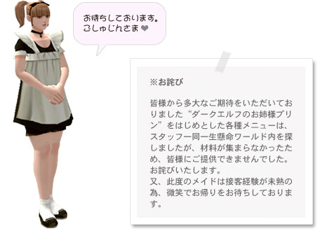 確かにメイドさんは現れたが、何もおきないらしい。DE姉さんのプリンを食いに来た人々の怒りが爆発している。ウサギもいるらしい。みえないけど。