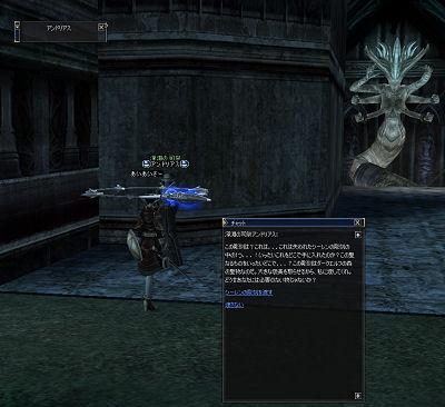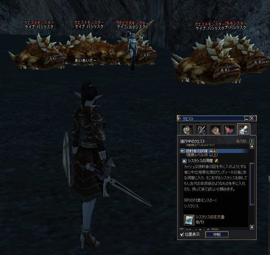 滝の近くに洞窟があるらしい。ヤケに広い洞窟を入っていったら、いましたよシスラシスとバシ。「ソロではつらい」と聞いているので緊張する。攻撃速度と移動速度POT飲んで、バシを一匹素手でたたいてみた。お~、リンクしないで一匹だけ来たよ。ちょっと離れたところでSS使って斬ったら。まだ近すぎたようで全部こっちに来ちゃったよ!「やっちゃった~」と思ってUD発動、高級体力回復剤を1個飲んで殴りまくり。シスラシスは2番目に死亡、UDが切れるまでにバシも全部殲滅。あれ?やけにあっさり終わっちゃった。しかも、慌てててディフェンスオーラとアタックオーラをかけ忘れてた。ま、終わったからいいや。鍵は1個拾ったよ。宝箱開けたら石拾えた。なんだろ、これ?
