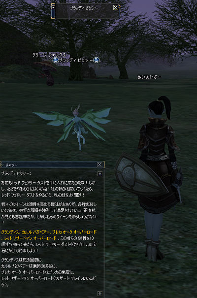 アルケニアとか言う姉ちゃんの指示を仰ぎ、ブラッディピクシーとティ ミ リランを探しに行く。きのこのところにいたので指示を仰ぐ。