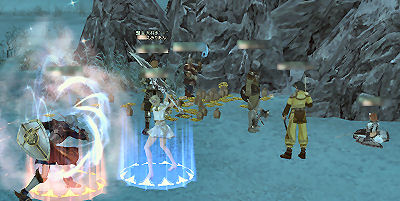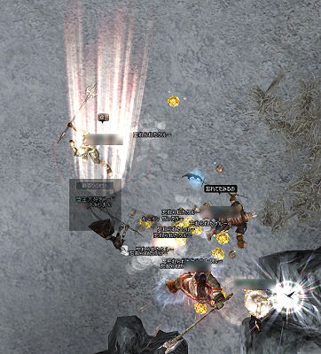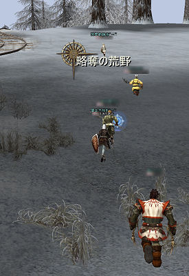 岩陰に集まって槍を持たされました。有無をも言わさぬ若年層育成クラハン開始です。そこらの家族MOBを引っ張ってきて岩陰に誘って寄ってたかって槍でタコ殴りです。ちなみに赤ネームだらけ。5~6人で殴ってると一瞬です。経験値も一匹では白名とかわんないけど、いっぺんに沢山狩るからどかーんと貯まる。ドロップしたお金やアイテムはそのままでとっかえひっかえ連れてきてはタコ殴り。