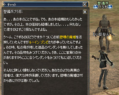 村の中をかけずり回って、こんどは悲嘆の廃墟でゾンビ倒してこいと。てけてけ走って行ったもののゾンビなんていねえし。村抜けた丘にいるのを見つけるまでに結構な数の骨を倒してましたよ。