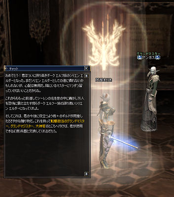 転職クエ終了の話をしていたら、血盟内でのお父さん(笑)が「ミスアキュが安いから買っておいてあげるよ」と、私がお金など持っていないのを承知で出世払いで立て替えてくれていました。うれしいよう。それを受け取るのと、転職してアカデミー卒業になっちゃうのでまた血盟に入れてもらうのにレース場へ。初めてカルミ着たとこを見せながら、ミステリーソードを受け取る。その場で手に持ってWWかけてみたんですが、カルミセットの効果もあって詠唱が早いよ~^^。いいんじゃない?