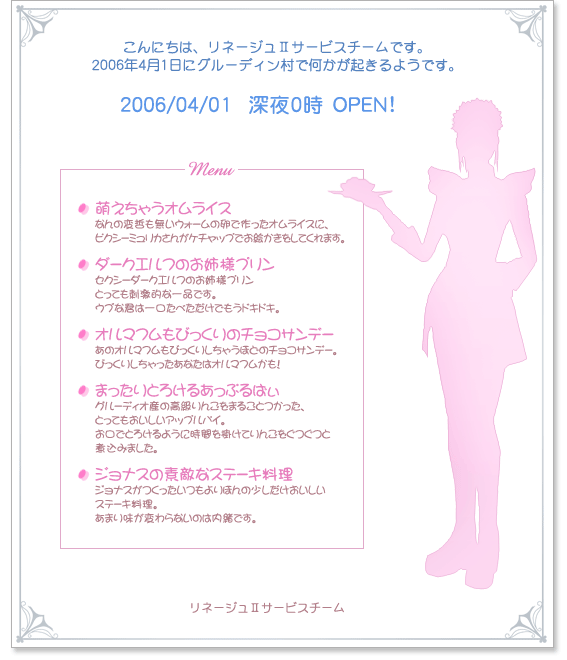 Lineage II(R) and Lineage II(R) the Chaotic Throne are trademarks of NCsoft Corporation. 2003(c) Copyright NCsoft Corporation. NC Japan K.K. was granted by NCsoft Corporation the right to publish, distribute, and transmit Lineage II the Chaotic Throne in Japan. All Rights Reserved.