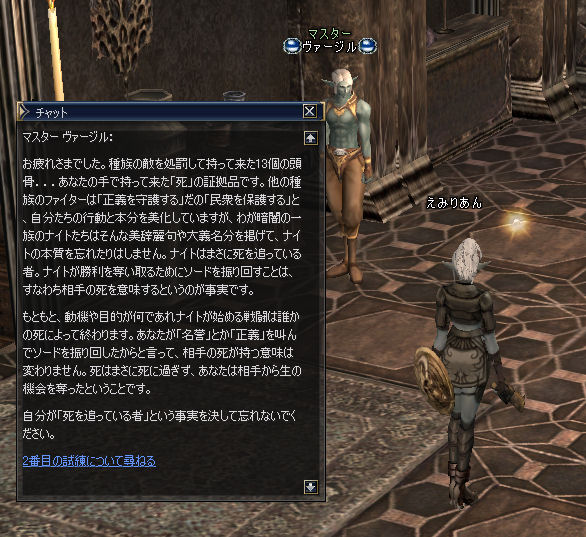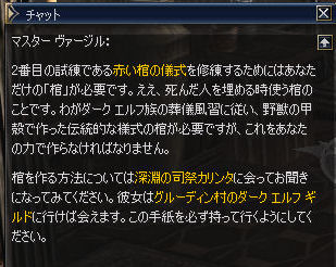 今日ものんきに遊んでLv20までいって転職してしまおう、なんて考えながら始めたんですよ。 DE村でゾンビ>骨>キノコ、一回だけダークホラー付きのクエマラソンを繰り返してるうちに17歳になったのでグルーディン村に出稼ぎしにきてました。さすがN最強剣+遠慮の要らないSS+強力な初心者バフでクエ一巡するのに30分かからないですよ。エルフやヒューマンより格段に早かったような気もする。あいあいさーはどうだったか・・・?覚えてないなあ。知らないからうろちょろやってたんだろうなあ。 でね、お決まりのフェルメル往復をしてたわけです。あっという間にクエアイテムが集まって帰還してはまたGKで飛んで惨殺・・・19歳もすぐやってきました。今日は休みの日なのでのんびり転クエしてみようか、と始めたわけです。